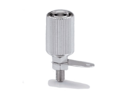 まず、一つめはターミナル写真にて、一番上の部分(緑色のレットの入った部分)をツマミと呼びますが、そのツマミ部の頭頂部(正確には、ツマミの内側にある金属の端部)に直径約4mmほどの穴が開いており、いわゆるバナナプラグ(写真5)=別名:バナナチップが挿入できます。(バナナプラグに関しては、あとで、チップジャックの項にて若干の記述をしています。)