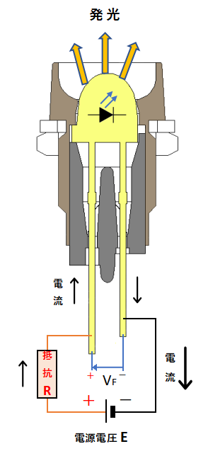 作業としては電源電圧から順電圧を引いたものを電流値で割るだけです。 超有名な オームの法則 そのものですね。 順電圧を引くのは、簡単に言えば、順電圧は、5Vで使っても、12Vで使っても、いかなる電圧で使用する場合も、LEDが点灯する際に必要とする共通の電圧であり変わりません。 で、その分の電圧は電流の大きさには寄与しないからです。 上の図をご覧ください。 イメージとしては、台の上に乗った人の、台を含めた高さが回路電圧に相当し、台の高さがVFと考えると、回路電圧からVFを差し引けばもともとの身の丈が求められるみたいな、、、、で、、、、うーん、良い例えが見つかりません。 なにか、この《男の子に電気を流しちゃう》みたいな感じの図と言い方で、かえって分かりにくくなってしまったかもしれませんね。m(_ _ )m