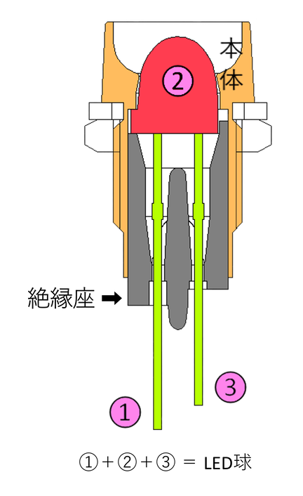 DBの代表的な構造は、左図のようになっています。 左の図において、 ① 端子(+の電圧をかける側。相対的に長い側。アノード。)、 ② LEDランプ本体部、 ③ 端子(-の側。相対的に短い側。カソード) とありますが、①, ②, ③を合わせて単にLEDと言ったり、LED球、あるいはLEDランプ、LED素子と言ったりもしますが、LED素子と呼ぶのはある意味正しくはありません。 また、形が砲弾に似ているため、【砲弾型】のLEDと呼ばれることもありますが、以下において、単純にLED球と呼ぶことにします。